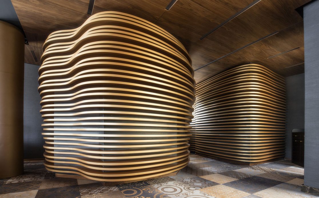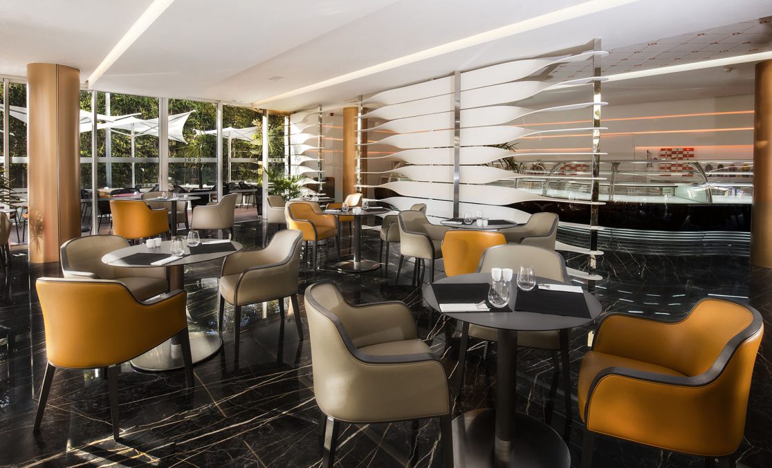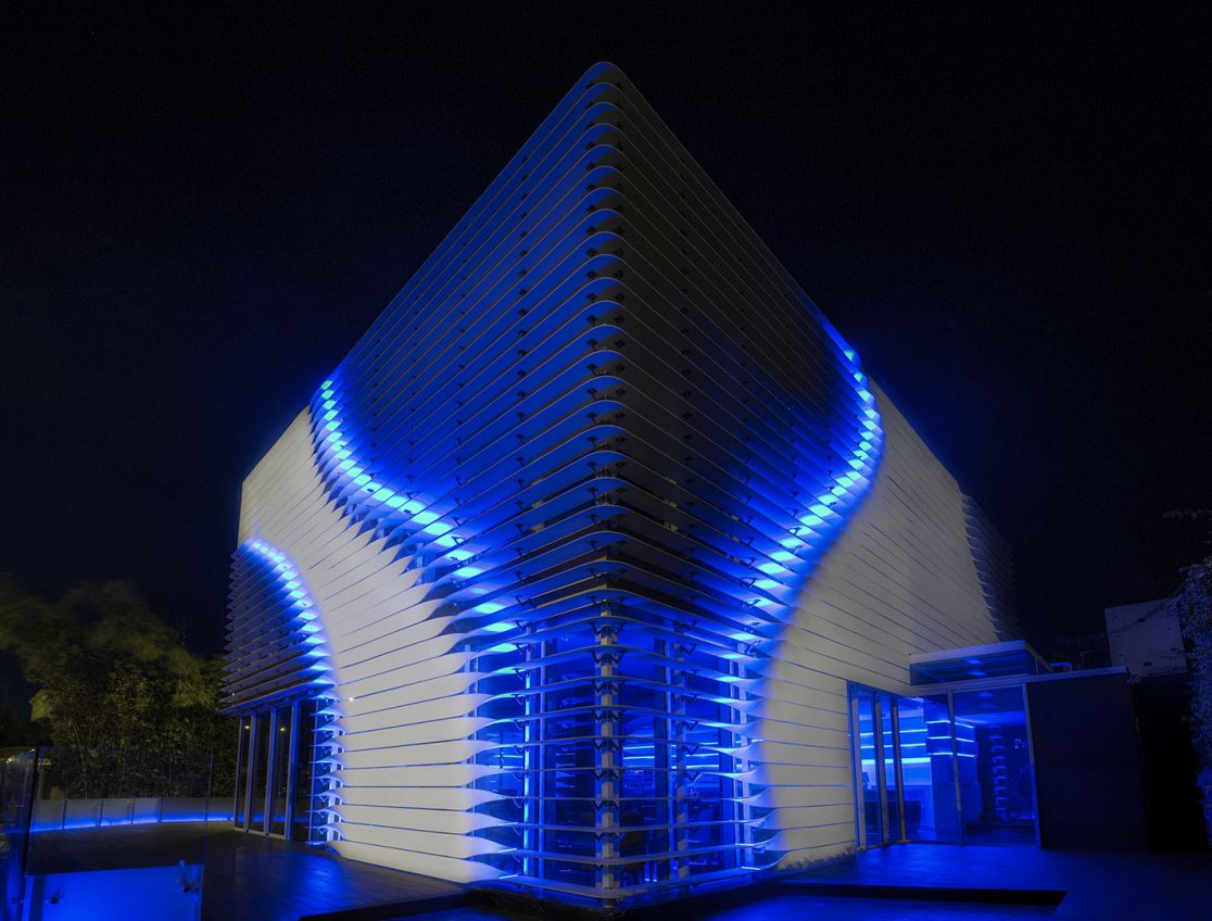 A Food and beverage Villa consisting of Pastry shop and caf in ground floor and Gastronomic restaurant in first floor. The design is inspired by the packaging ribbons of cake boxes; PoD created a double skin facade of an intense white, light and see-through; thus, providing to glazed interior spaces a protection from direct sun rays. The horizontal blades which envelop the 3 main facades rotate at 90 degrees depending on intimacy and sun orientation. During the night, a dynamic lighting composed of about a hundred of Led ribbons animate the facade with color changing scenarios.