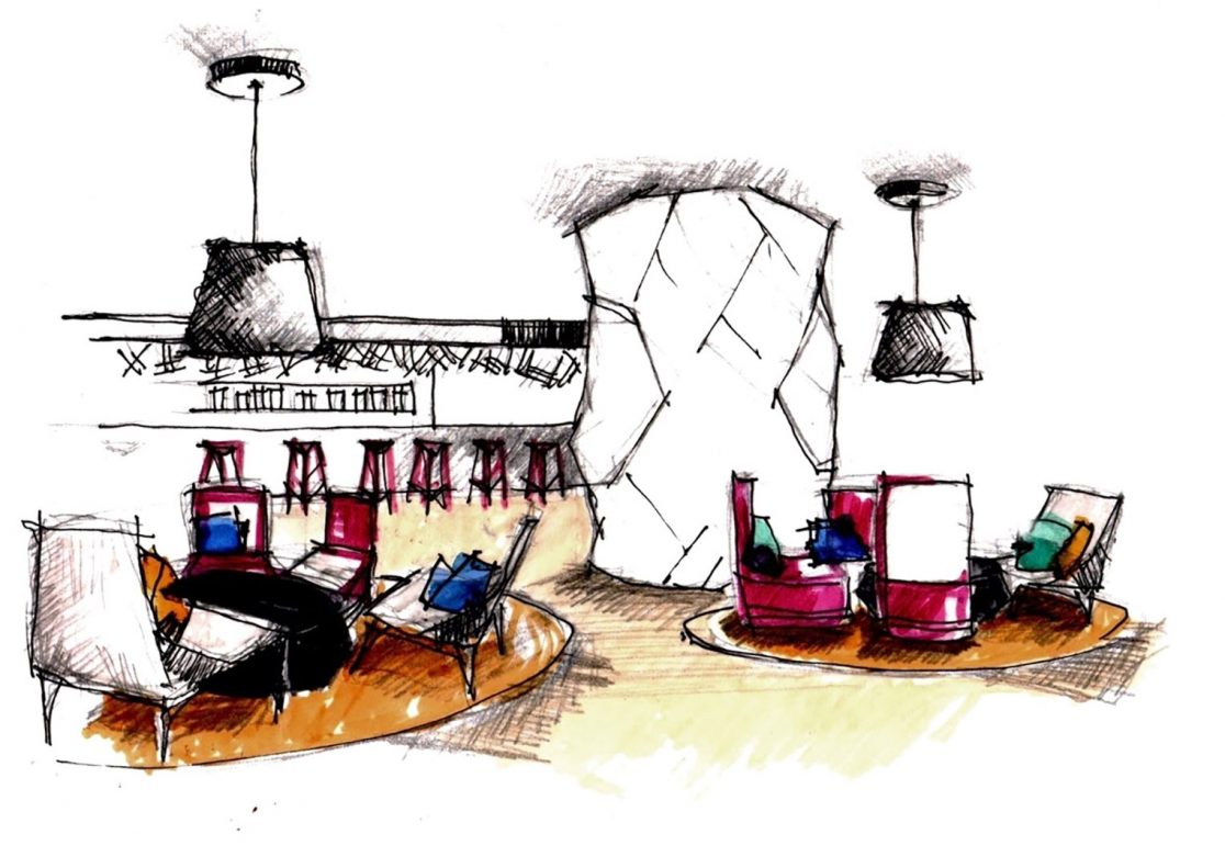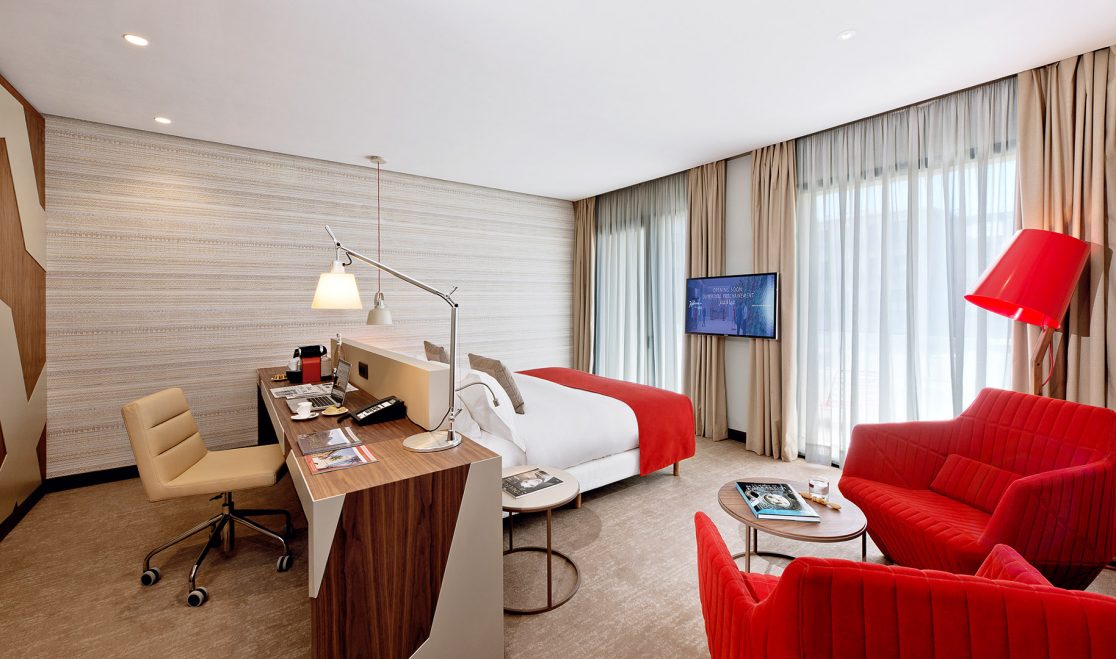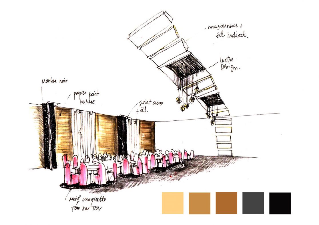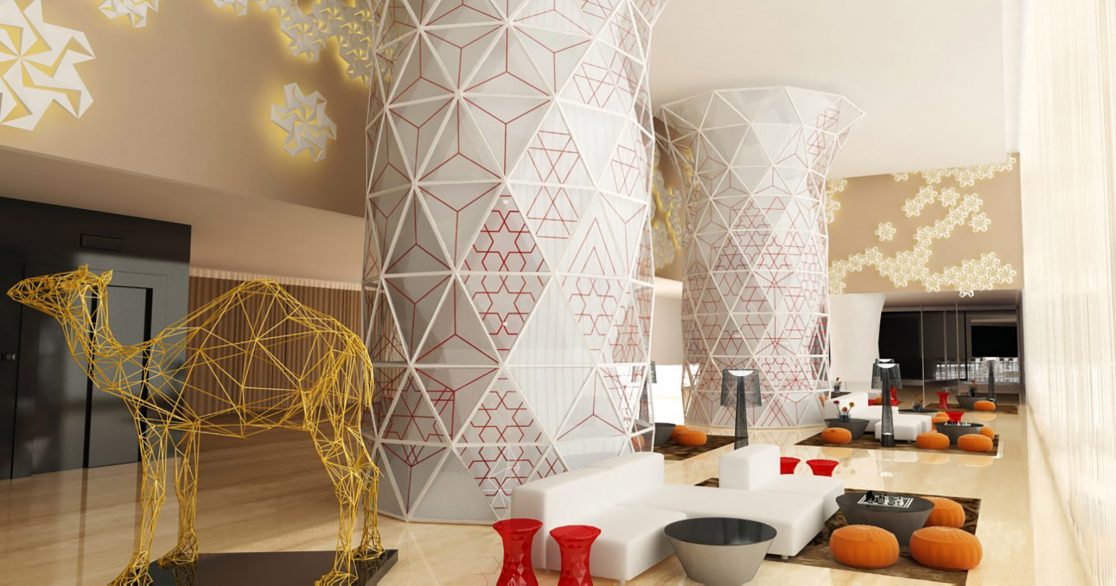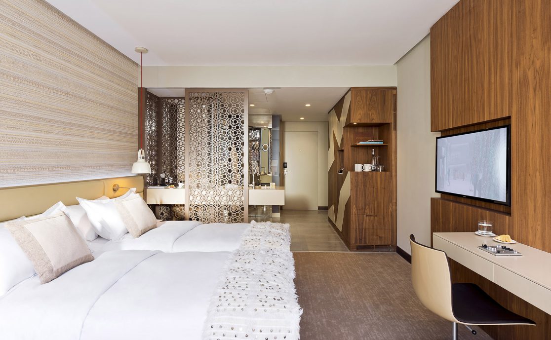 Xavier Guerrand Hermes and the investment fund Actif Invest invited PoD to sign the accommodation of their Marrakech property operated by the Radisson hotel chain. For the design studio the challenge was to create a contemporary and innovative aesthetic recalling the essence of Marrakech. The hotel is part of a mixed-use project including apartments and a shopping center called Carre Eden. Already in the medina of the red city, several Boutique-hotels were able to gracefully relook at the rich Moroccan heritage. The topic, here, concerns the heart of Marrakech, and more precisely the western part of the city called Gueliz. For this reason, PoD took a more tailored approach, with the challenge of extending the urban dynamic of the city while providing a relaxing and atypical atmosphere. The harmonious blend between ethnic patterns and classical Arab Islamic geometric shapes is also a major aspect of the design. Geometrics are distorted and grossly enlarged, creating full and empty spaces as in the closet, contrasting with primitive ethnic patterns on the wallpaper.
